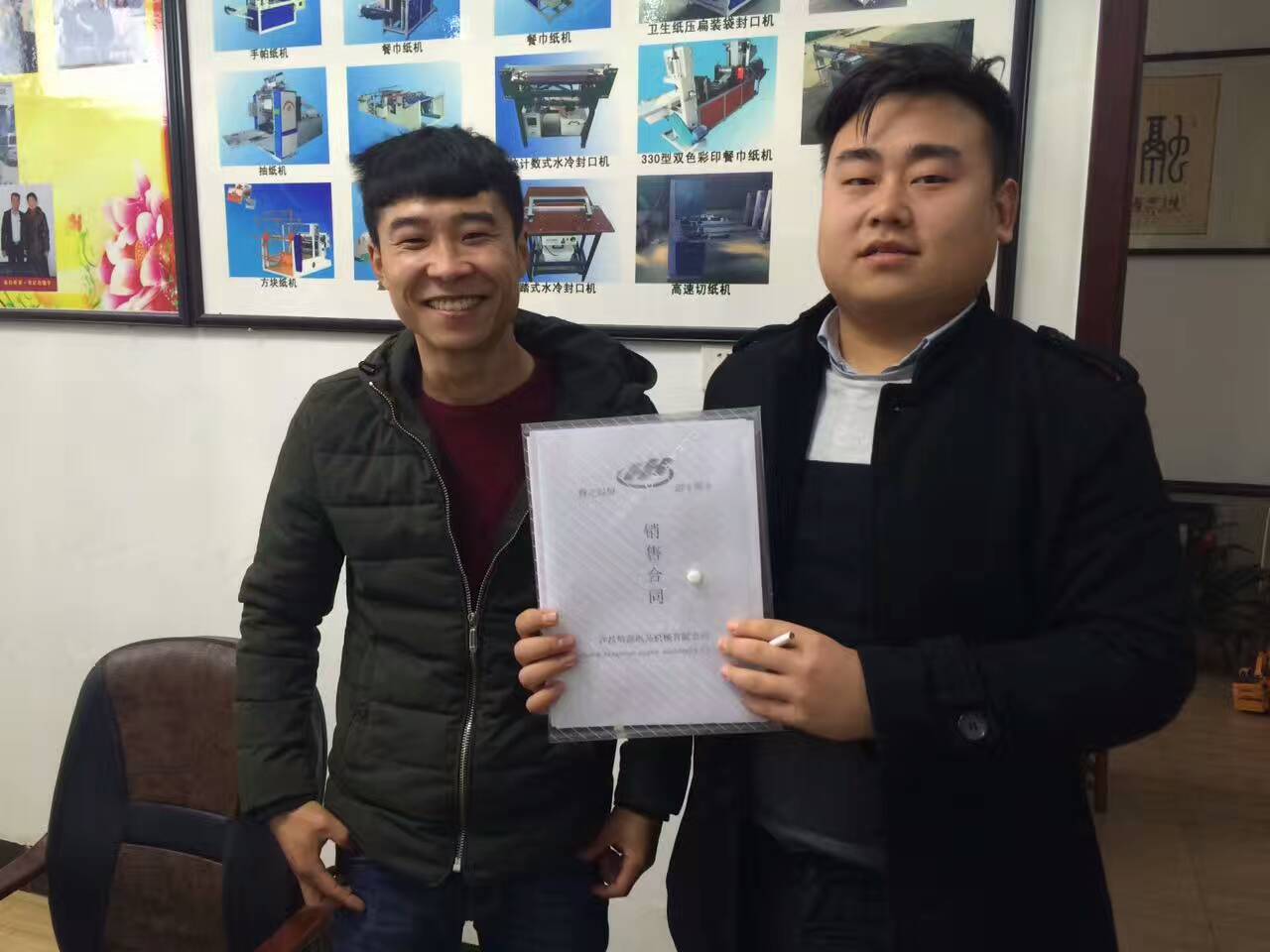 在3月17号邓先生一大早就自己开车从驻马店过来,看过恒源的卫生纸加工设备之后感觉特别满意,想直接拉走设备,但是确实现在厂里订单太多,已经没有现机。邓先生也非常体谅,当场签订了合同,购买了全自动卫生纸加工设备